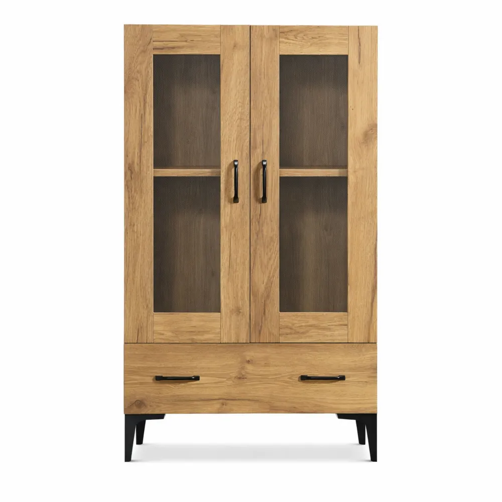 Questa vetrinetta offre un pratico spazio per l'esposizione e l'organizzazione di oggetti. Realizzata con pannelli di truciolare, presenta due ante in vetro che consentono una visione chiara del contenuto. Dietro le ante, due scomparti separati permettono una facile organizzazione. Un cassetto inferiore aggiunge ulteriore spazio per articoli da tenere nascosti. Le dimensioni compatte la rendono adatta a vari ambienti come soggiorni o sale da pranzo.